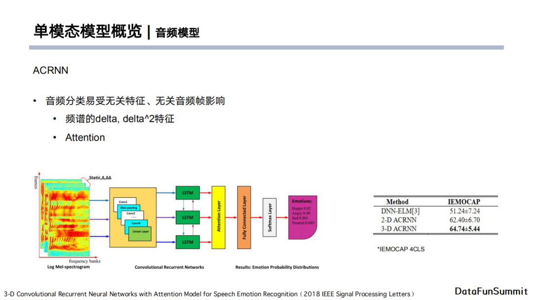 还有一些其他的工作,例如类似于文本RCNN的ACRNN模型,它先使用卷积层进行特征提取,再接上LSTM提取上下文特征,最后进行分类任务。值得注意的是,ACRNN加入了全新的特征处理方式,即加入了频谱的一阶以及二阶delta特征。Delta特征是对相邻帧进行简单的差分得到的特征。三种特征频谱图仿照图像的channel进行拼接。这种方法在后来的工作中被频繁使用,上图右侧的表格展示了加入delta特征后对情感分类具有正向作用。