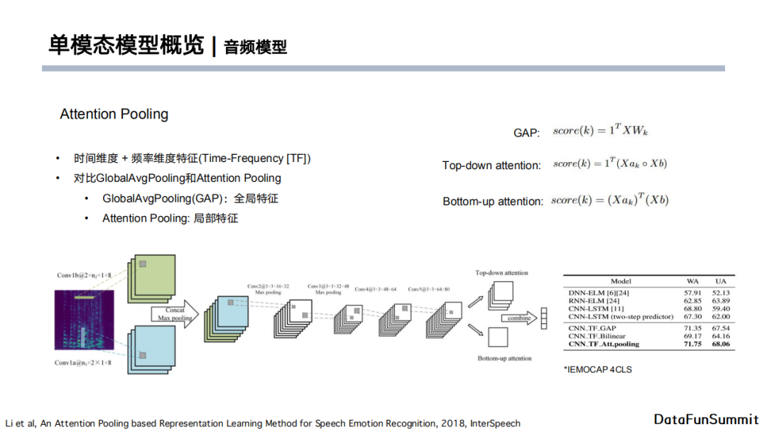 近期的一些工作使用了attention机制以及时间维度+频率维度的特征。上图的文章使用卷积层先沿着时间与频率维度分别提取特征,然后将提取的特征进行拼接后,再使用多层卷积神经网络做进一步特征提取,最后使用attention pooling得到一维的音频特征向量。这篇文章是第一个在IEMOCAP四分类任务中将准确率刷至70%以上的工作。