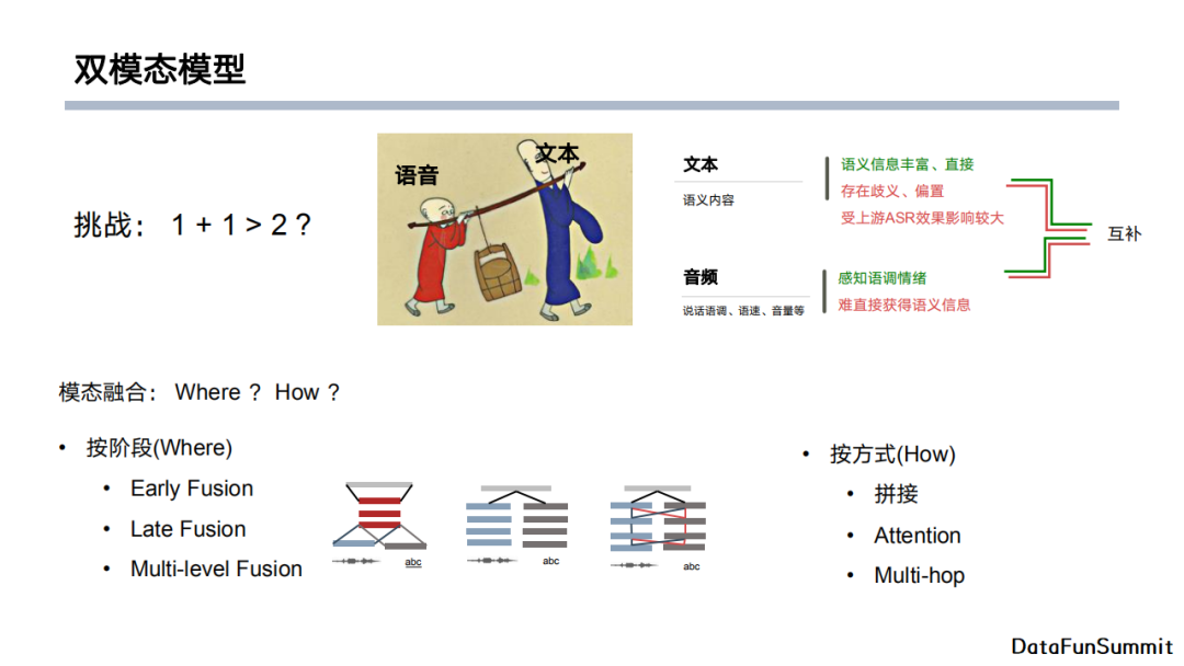 A:我们只在业务数据上做了测试,还没有在开源数据集上进行实验。我们的MSCNN-SPU模型在二分类的任务下,若只使用文本或者音频输入特征,它的准确率可以达到89%,而使用双模态特征作为输入的话准确率有了四至五个点的明显提升。这从侧面反映出双模态带来的信息交互与信息协同可以给模型带来增益。