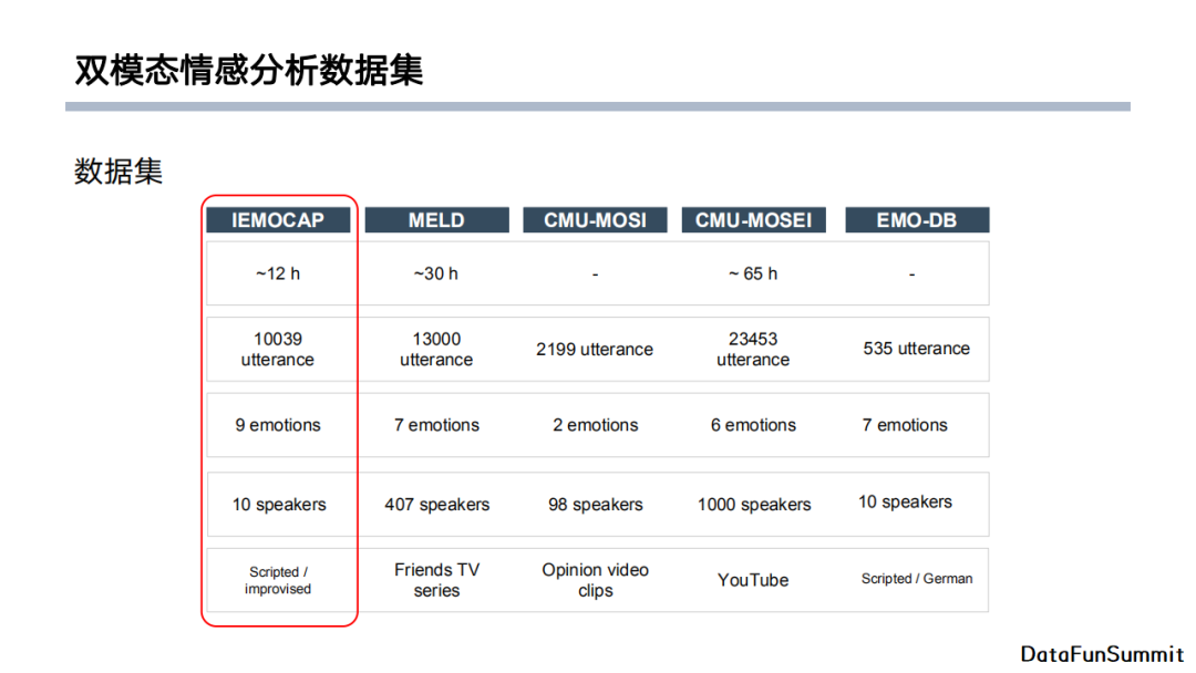双模态情感分析常用的数据集如上图所示。这几个数据集有的是请专业演员表演并进行录制的,有的是从如老友记电视剧中抽出带有感情色彩的一些段落,或者从YouTube视频中截取片段构成数据集。