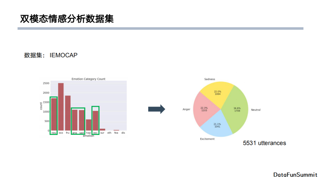 最常用的数据集时IEMOCAP,它包含9中不同情感,但是很多学术文章中只会使用四种,因为九种情感在数据集中分布很不均匀,所以大部分情况大家会选择其中四种:中性、愤怒、悲伤和兴奋,因为他们的分布最接近。最终使用的数据集是四分类的子数据集,包含5531条对话。后面介绍的双模态模型基本上都是使用这个数据集进行测试的。