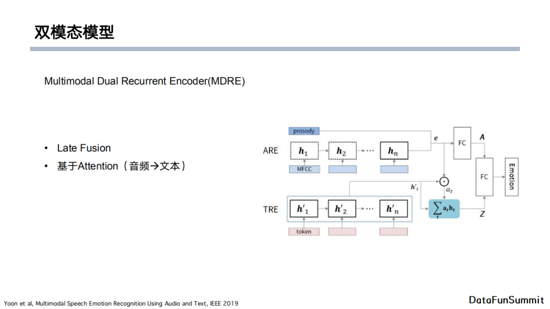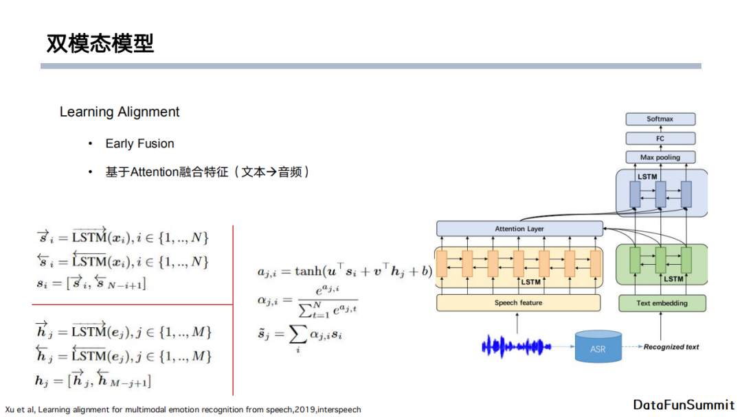 首先第一个模型是Learning Alignment,它是由滴滴研发团队提出的。它是基于early fusion的 方法,通过attention的方式进行特征融合。具体地,模型使用双向LSTM在输入端分别对音频和文本做了一个简单建模后,对每个token位置的向量拿出来做attention,计算公式如上图左侧所示。s代表speech,即向量是通过音频侧输入特征经过LSTM得到的,h则为通过文本侧输入特征经过LSTM后得到的特征。Attention相当于在文本的每个token位置对所有音频特征做query,这样做的目的是因为音频的长度和文本的长度不一样,经过LSTM特征提取后长度也不一样,那么如果我们可以用文本对音频做query的话,那attention后的输出特征可以与文本对齐。此外,这么做的意义在于使用文本token来寻找音频中与之最相关的音频,这也是这个方法被称为learning alignment的原因。经过early fusion后的特征再经过后面的LSTM以及MLP的网络结构进行分类任务。