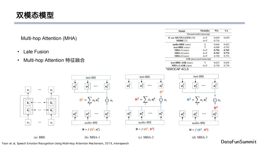 同一个团队在上一个模型的基础上又提出了multi-hop attention。前一篇文章中他使用了音频对文本的attention,那么也可以用文本对音频做attention。此外,attention后得到的结果还可以对文本和音频做attention。这就相当于只要有足够多的时间,可以堆叠很多层attention。这个方法实际上是想要有效地利用文本和音频之间的相互耦合的信息。上图右上角给出了最终的效果对比,大家可以看到基本上attention堆叠两层就可以达到最好的效果。这个模型在提出的时候在IEMOCAP数据集上达到了SOTA的效果,后续我们自己的工作也会与它进行比较。