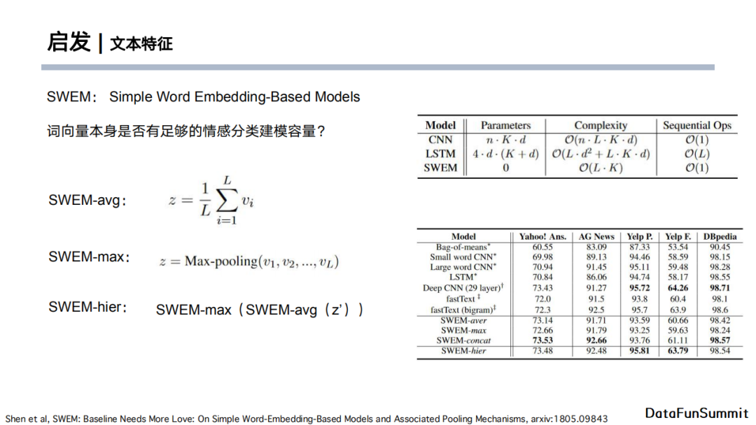 基于上述启发,我们去查看了不同的文献,从文本特征角度来看,我们发现一篇SWEM,他的想法是既不适用CNN又不使用LSTM,只使用最简单的词向量。文章中提出了三种方法,第一种是直接将词向量取平均(SWEM-avg),第二种方法是沿着词的方向做max pooling,第三种方法是先对词向量取平均再做max-pooling。文章经过对比实验后发现SWEM这种很简单的模型在参数量上占有很大的优势,从上图右下角表格也可以发现其效果甚至超过了fastText。这也启发了我们使用浅层的特征来做文本+语音的情感分析。