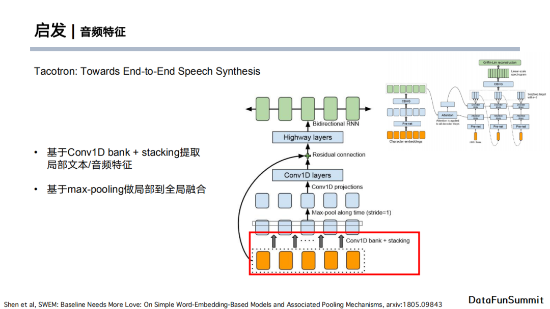 从音频方面,我们借鉴了音频做tts的相关工作。做音频的同学可能对Tacotron比较熟悉,它使用了大量类似一维卷积bank的结构。它在文本转化成音频以及音频转化为最终音频输出的时候,都使用了一维卷积bank的结构,最终得到的效果也很不错。这就启发我们去学习它的网络结构。一维卷积bank是使用一系列一维卷积网络,每个卷积层的卷积核大小不同。Tacotron在一维卷积bank特征提取完成后会进行堆叠作为最终的浅层特征输出。后续会使用max pooling将特征从二维压缩至一维。我们的工作也借鉴了Tacotron的方法。