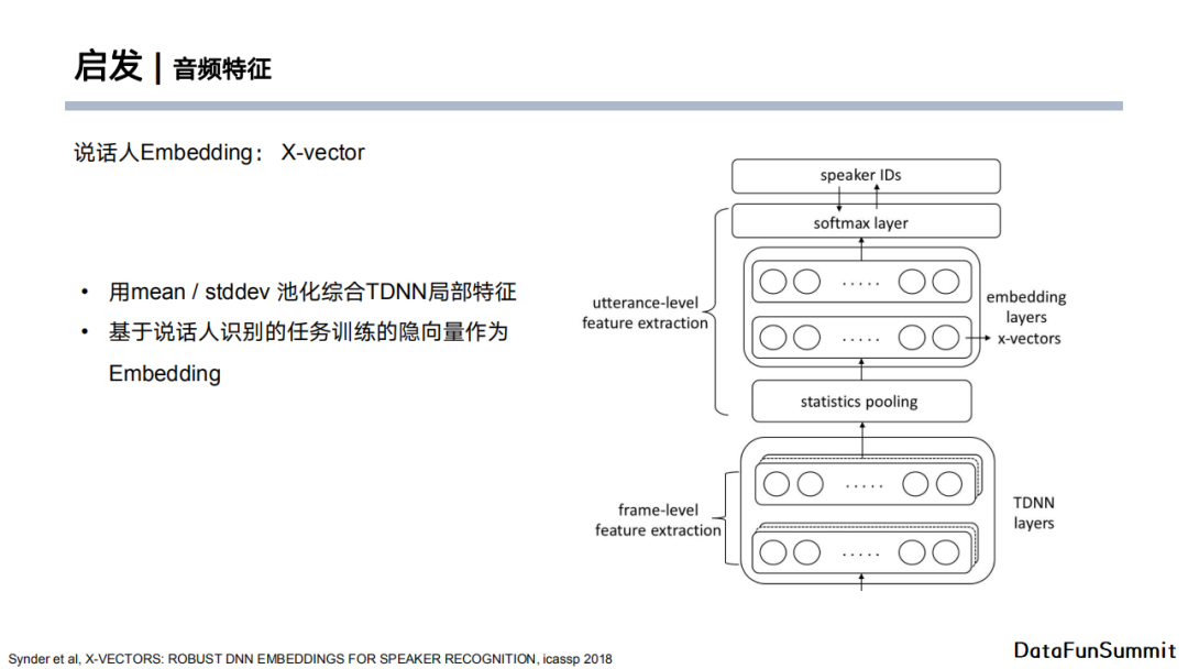 针对第二个问题,X-vector本身是被嵌入至KALDI这一工具中的,它的使用场景主要在音频领域,例如做说话人识别等。它有开源的数据与框架,并且有在开源的音频数据集上预训练好的模型。我们就使用了预训练好的模型来提取特征。TDNN本身是一个分类网络,内部结构类似于卷积神经网络。整个模型就是通过多层TDNN提取音频特征,之后使用pooling与全连接层进行分类任务。它的训练方式类似于Transformer,是在大量的数据集上(包含很多场景、背景)使用了大规模预训练,所以最终我们可以使用分类层之前的隐向量作为与说话人相关的特征。此外,这个特征向量还可以过滤大量的噪声信息,如环境因素、信道影响等。