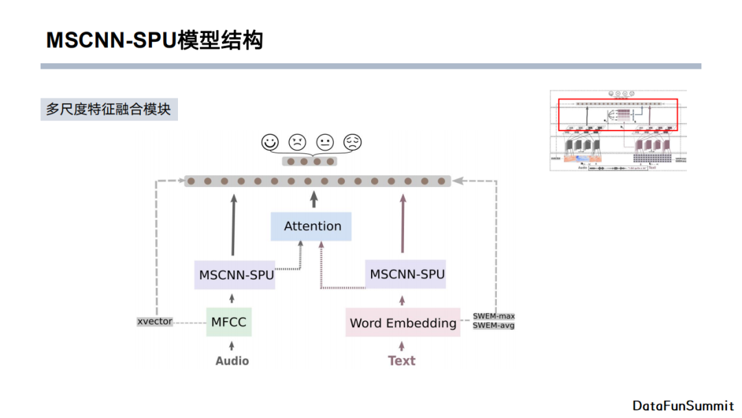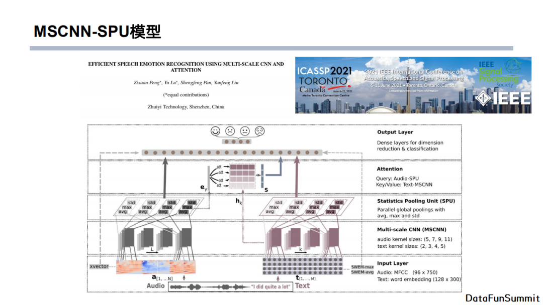 首先介绍是什么启发我们提出针对双模态情感分析的MSCNN-SPU模型。我们对大量的数据进行了分析,包括中文数据以及IEMOCAP数据。最终发现由于这些数据是基于口语对话场景的,从文本角度来讲它们的句子相对较短,那么对于情感分析任务来说它的局部信息的贡献较高。从语音模态来看,模型对音频依赖更倾向全局统计特征,即人的情感表现在这些短对话中,在音频的表现形式上基本保持一致。但是不同的人说话可能有不同的音调高低,不同的说话尖锐程度,所以我们认为需要引入一些与说话人相关的个性化信息。