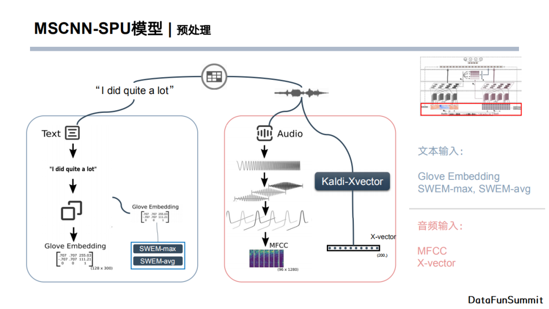 首先我们来看一下输入层。对于每个样例,我们需要获取对应的文本以及音频,其中文本可以使用音频ASR技术得到。针对文本输入,我们采用经典的NLP领域的做法,即先对其进行分词,然后使用Glove Embedding得到词嵌入向量。我们这里也使用了SWEM-max和SWEM-avg两个一维的特征向量作为模型的输入。针对音频输入,我们提取其MFCC特征以及预训练的TDNN模型中可以提取的说话人相关特征X-vector。值得注意的是,TDNN的训练是使用目标数据集之外的预训练数据,所以这里不会存在信息泄露的问题。