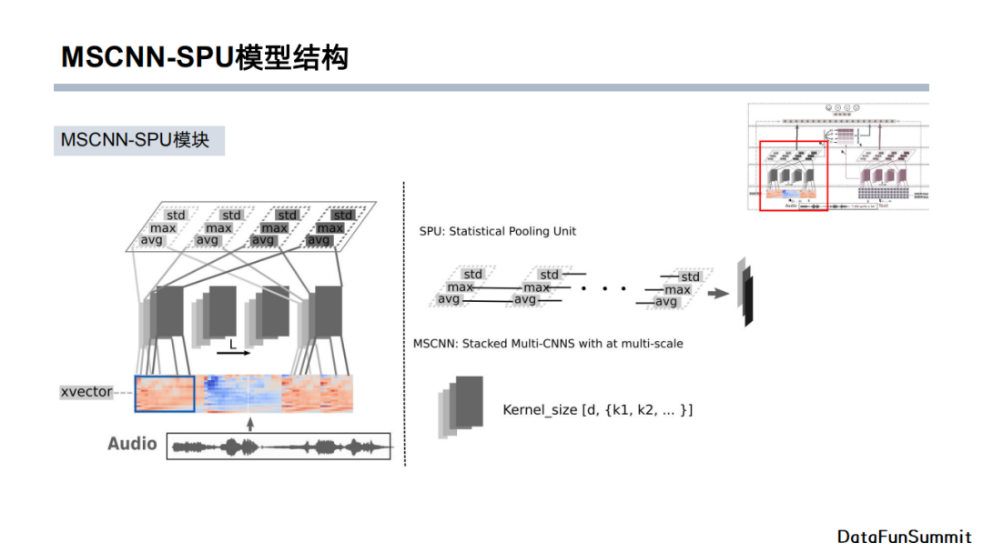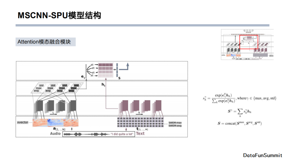 接下来介绍MSCNN-SPU模块。首先MSCNN是一个多尺度的卷积神经网络。实际上它是一个浅层网络,每个尺度下只包含一层CNN,但是MSCNN通过使用并行的不同尺度的CNN来进行滑窗操作。CNN的核函数大小是{d,{k1,k2…}}。我们将每一个CNN得到的二维特征送入SPU模块。不同于传统的average pooling和max pooling层输出一个的一维向量,SPU输出的是特征向量的标准差、最大值以及均值。这是因为我们考虑到在音频领域,传统的特征处理方法更偏向于音频的统计学特征。对于一个特征,假如它遵循高斯分布,那么我们感兴趣的统计学标准有分布的中心位置(avg),最高点(max)以及宽度(std)。所以我们用三种pooling输出的结合来刻画音频的统计学特征分布。文本输入侧与音频输入侧的MSCNN-SPU均具有相似的结构。