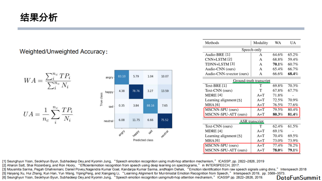 上图展示了我们的模型的实验效果。这里给出了两个评价指标:加权准确率以及非加权准确率。由于不同数据集类别具有差异,加权准确率会计算所有True Positive的数量,并除以数据样本总量;而非加权准确率则针对每一个类别计算准确率,最后计算平均的指标。实验中使用的Ground-truth transcript是人工标注的文本,而ASRtranscript是通过ASR转写的文本。通过实验结果可以发现我们的模型超过了SOTA大约3~4个点。从混淆矩阵可以看出大部分判断错误的类集中在中性类别上。实际上这个现象比较合理,因为中性情感本身就位于不同情感的交界点上,所以对模型、甚至对人来说情感判断的难度比较大。