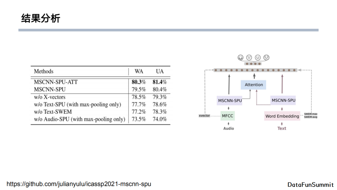 此外,我们也进行了消融测试。比如我们把attention模块去除以后,模型的效果从80.3%下降到79.5%。又比如我们丢弃X-vector、SPU或者SWEM后,模型的性能都有不同程度的退化。我们还将模型MSCNN-SPU部分与传统的LSTM方法进行了对比,比如将文本部分替换成BiLSTM会使模型效果从79.5%下降至72.4%,而将音频部分替换成BiLSTM则会使效果下降至74.3%。所以,相较于传统的LSTM模型,我们提出的MSCNN-SPU具有一定优势。这个项目的代码会被上传到上图左下角的链接。