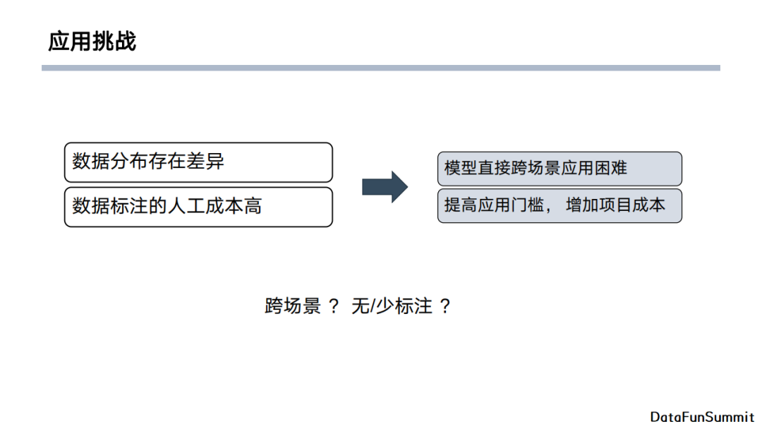 首先简单了解一些模型应用中存在的挑战。我们在一个数据集上训练一个模型并将其迁移至线上进行使用,但是预训练的数据集与线上场景不同,但又属于同一个任务,那么这时候由于数据分布存在差异,模型线上应用的效果就会比较差。此外,另一个问题是数据标注的人工成本较高,尤其是涉及到音频标注时,其标注时长很长,这无形之中提高了模型的应用成本和门槛。那么我们就想找到一种在少量甚至没有标注的情况下能达到模型跨场景应用的方法。