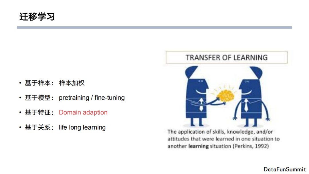 首先我们想到的是迁移学习,它本质上是想将一个模型的知识迁移到另外一个新场景的模型中进行应用。迁移学习有基于样本的方法(如样本加权),基于模型的方法(如预训练+fine-tuning),基于特征的方法(如域适应)和基于关系的方法(如lifelong learning)。