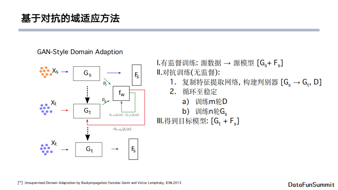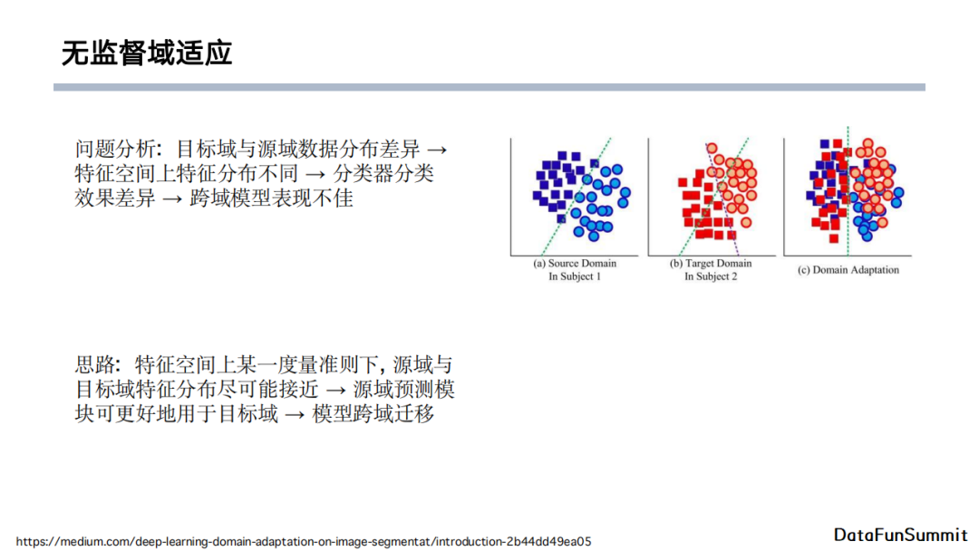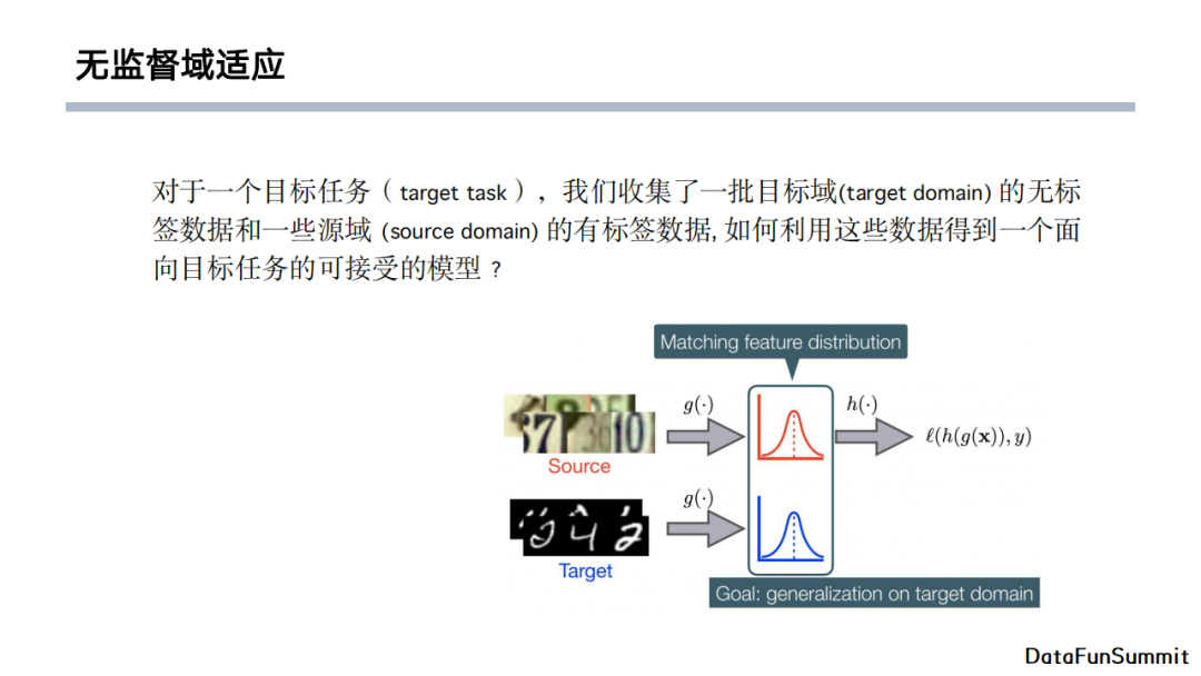 因为标注成本较高,我们的目标是仅使用目标域的无标签数据对业务模型进行微调,使得模型在目标域上得到较好的效果。那么我们就需要使用域适应的方法。首先我们需要明确什么是域。粗略来讲,它反映了了同一数据格式的不同形式的表达。例如从图像上来讲,一个白色背景与自然场景下的自行车就可以被认为是在不同的域内。对于大数据来说,它的来源可能来自于保险行业,也有可能来自于银行产品,因为场景不同,数据的分布也不同,可以被认为是在不同的域内。从音频角度来讲,一个无噪环境与夹杂着背景噪声的音频也是在不同的域。