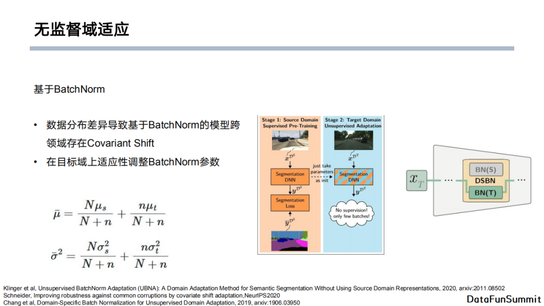 无监督域适应有很多不同类型的解决方案。首先介绍一下基于BatchNorm的方法。前面我们提到,域适应的目标是将不同域的数据分布进行对齐,而BatchNorm本身就具有对齐数据分布的属性。它会在训练过程中保存训练数据的running mean以及running std。如上图右侧所示,一个简单的方法就是在源域中训练一个带有BatchNorm的模型。尽管目标域没有标注数据,但是我们有原始输入数据。我们可以将这些数据输入至模型,同时将BatchNorm层的均值和方差调整至目标域中,使得它能够符合目标域的数据分布。这相当于只去改动训练好模型的BatchNorm参数,就能完成目标域与源域数据分布对齐的目标。但是这里有一个比较强的假设:BatchNorm仅有的参数是均值和方差,这样也就忽略了数据中的很多信息,即数据的均值和方差并不能完整地体现数据的分布。