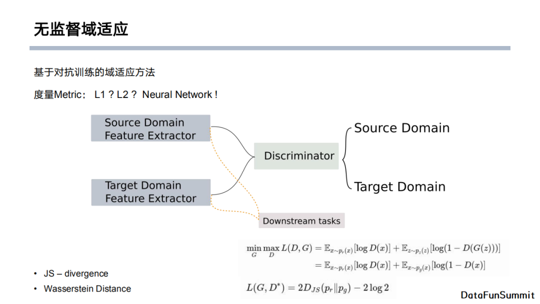 具体地,如上图所示,我们有源域和目标域的特征提取器。首先,模型从源域提取特征输入至下游的任务,如分类任务。由于源域是有标签的,所以我们可以训练下游任务中的分类器。另一方面,目标域是没有标签的,我们可以使用判别器判断输入是来自于源域还是目标域,同时在训练目标域的特征提取器时尽可能迷惑判别器,从而达到目标域的特征分布与源域的特征分布的距离尽可能接近的目的。在对抗学习的范式中,我们通常使用JS距离作为距离度量标准。当然,我们也可以使用Wasserstein距离(推土机距离)。