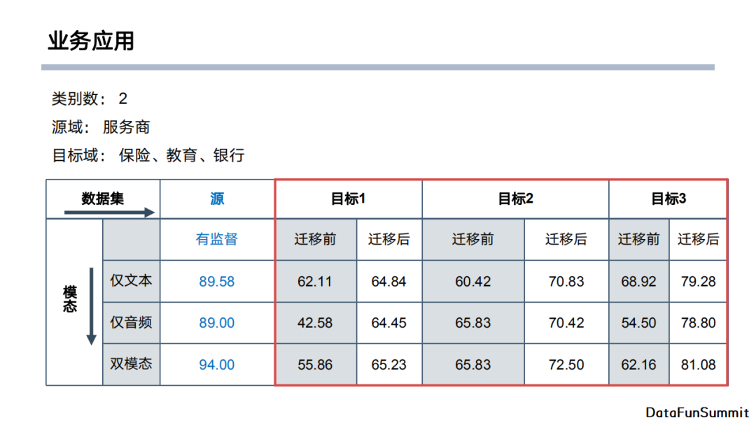 我们在业务数据中对方法进行了检验。比如我们做了一个简单的双模态二分类模型,源域选择服务商的数据。如上图所示,在有监督训练的情况下,单模态的准确率可以达到89%,而双模态模型的准确率可以达到94%,这也体现了双模态模型的优势。我们的目标域有三个:保险、教育、银行。我们的目标是将在原域上进行有监督训练的模型,直接使用在目标域上,并且取得还不错的效果。这里我们对比了迁移前和迁移后的测试结果,可以看到迁移前模型的分类准确率在60%左右。使用对抗学习域适应的方法对模型进行参数的微调后,准确率的提升大致有二至四个点。所以,对抗学习域适应方法在应用中,相比于直接把训练好的模型放到一个未知领域,其效果很更加理想。但是它存在的问题是效果提升的可控性,这也有待后续研究去继续探索。