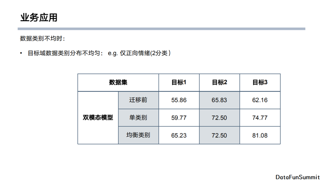 另外,在很多实际应用场景中,目标域数据类别分布并不均匀。我们虽然不需要目标域的标签,但是它的数据经过随机抽取后,可能得到的正向标签较多。在这种数据类别不均衡的情况下,我们也希望观察对抗学习域适应方法的迁移效果。从上图表格中可以看到,针对仅包含单个类别的数据,模型在迁移后的分类效果相较于迁移前有一定的提高,但是在一些情况下无法达到均衡类别的指标。这是因为单个类别的数据缺少了类别分布的信息,使得模型在做迁移的时候稳定性较差(例如目标2)。