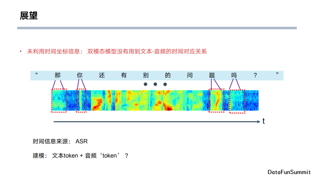 首先,我们之前介绍的模型实际上并没有利用到施加坐标信息,也就是说我们并没有将一句话的音频的起止时间和文本起止时间进行对齐。在后续的模型优化中,我们希望找到能够把时间信息加入的方法,使得音频和文本中每一个token进行对齐。