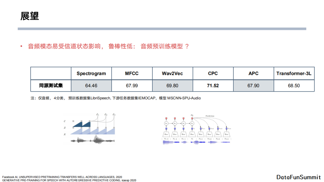另外,由于音频模态的状态空间非常大,容易受到信道状态影响。比如通过电话听到的声音和面对面听到的声音是有所区别的,这是因为它受到了信道状态甚至远场效应的影响。目前,音频特征的鲁棒性有待提高。近期有很多尝试使用预训练的模型来进行音频特征的提取,如上图表格中Wav2Vec、CPC、APC、Transformer-3L。它们先在大量数据上对音频特征进行预训练,再使用预训练完成后的特征完成下游任务。我们也做了一些简单的对比实验,可以看到这些预训练模型很有潜力,如CPC模型可以超越传统MFCC得到的特征。这个方向也是将来双模态模型可以重点关注的。