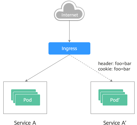 假设线上已运行了一套对外提供七层服务的Service A,此时开发了一些新的特性,需要发布上线一个新的版本Service A',但又不想直接替换原有的Service A,而是期望将Header中包含foo=bar或者Cookie中包含foo=bar的用户请求转发到新版本Service A'中。待运行一段时间稳定后,再逐步全量上线新版本,平滑下线旧版本。示意图如下: