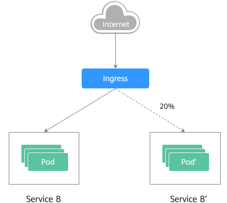 假设线上已运行了一套对外提供七层服务的Service B,此时修复了一些问题,需要发布上线一个新的版本Service B',但又不想直接替换原有的Service B,而是期望将20%的流量切换到新版本Service B'中。待运行一段时间稳定后,再将所有的流量从旧版本切换到新版本中,平滑下线旧版本。