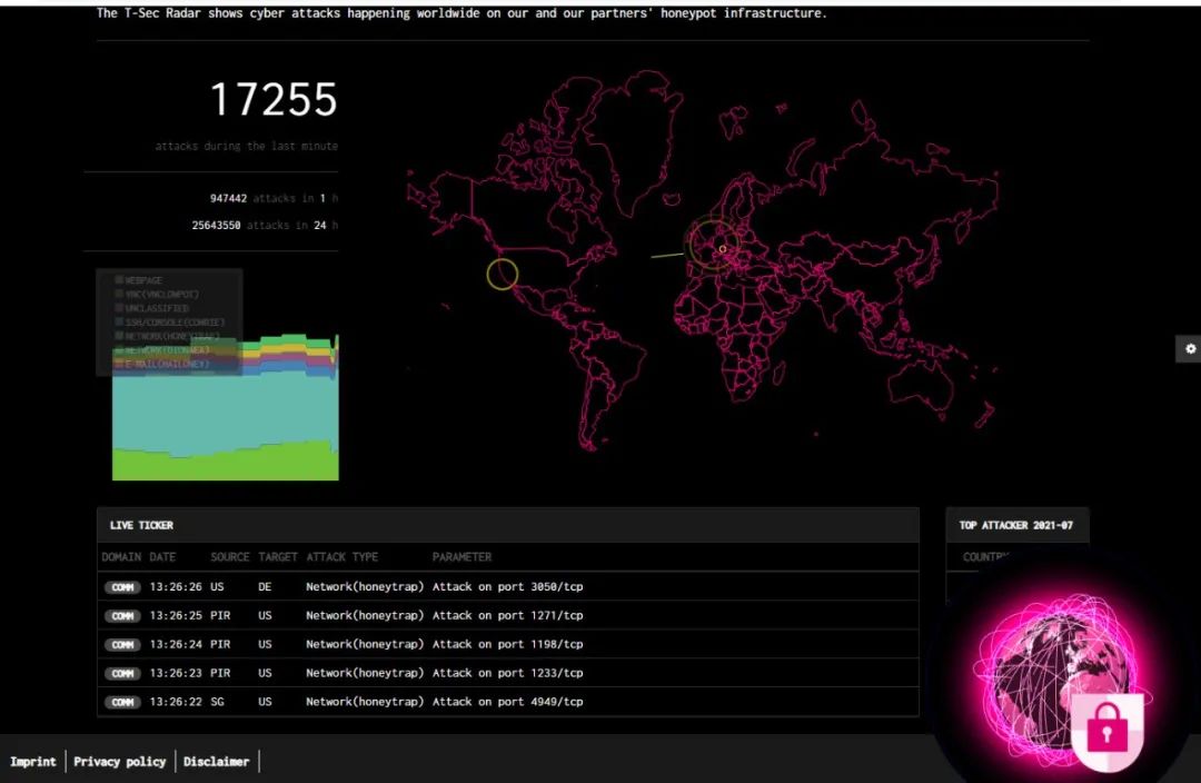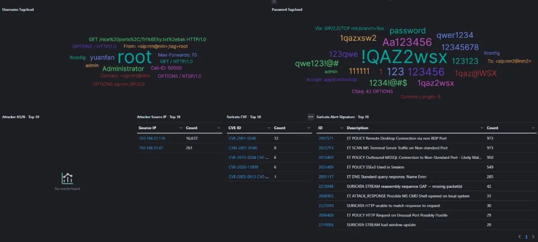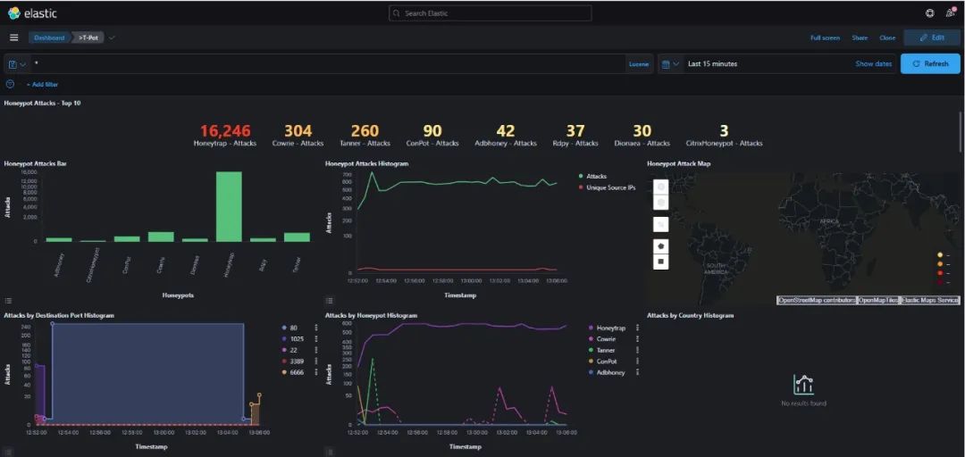 T-Pot 框架从每个容器收集所有日志,然后集中到一个弹性堆栈中,从而为管理员提供了针对每种服务的所有攻击的前端视图。还捕获了恶意软件样本,从而提供了进一步分析攻击的能力。