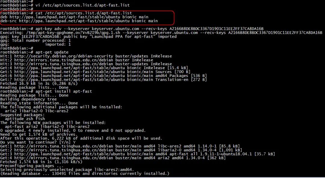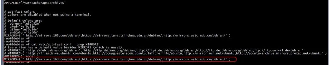 echo "MIRRORS=( ' http://mirrors.163.com/debian/,https://mirrors.tuna.tsinghua.edu.cn/debian/,http://mirrors.ustc.edu.cn/debian/' )" >> /etc/apt-fast.conf