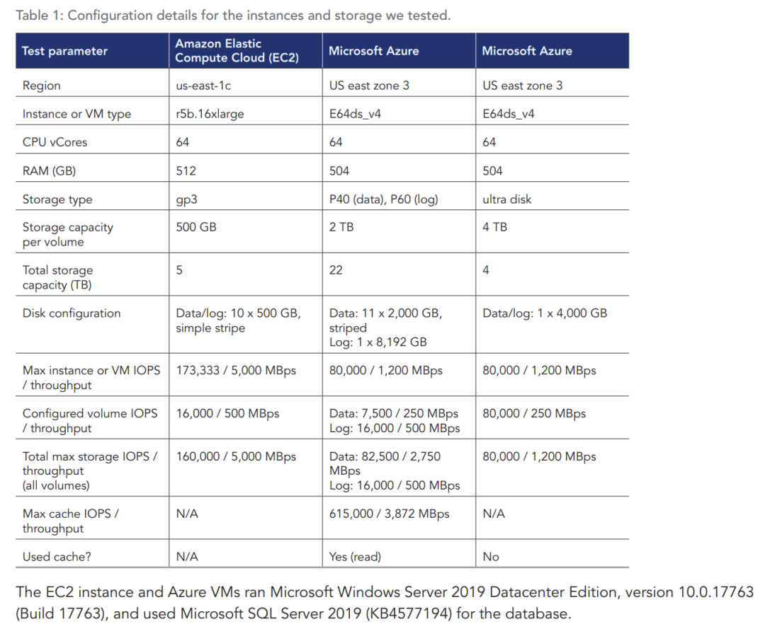 Principled Technologies的报告喜欢用NOPM这个单位,说的是new orders per minute,每分钟的订单数,在测试中,AWS r5b.16xlarge的NOPM是E64ds_v4加Premium SSD(上图中的P40+P60)的1.7倍,是E64ds_v4加Ultra Disk的2.7倍。