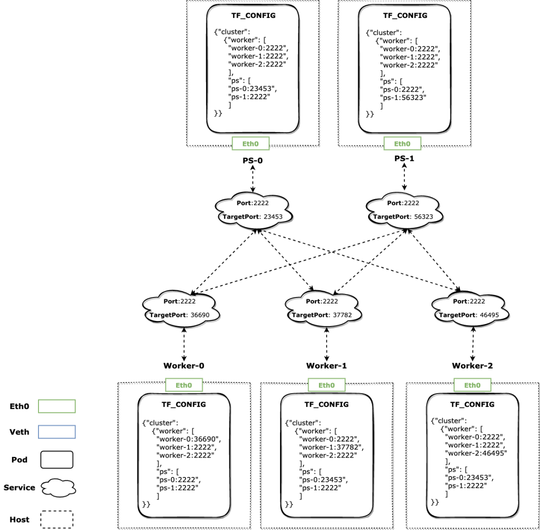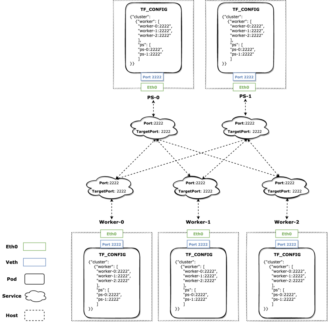 我们以 Tensorflow 作为主机网络的例子,因为它的 Cluster Spec 复杂性更具代表性,但 KubeDL 的内置工作负载(如 PyTorch,XGBoost 等)我们也都针对其框架的行为实现了对应主机网络模式的网络拓扑设置。