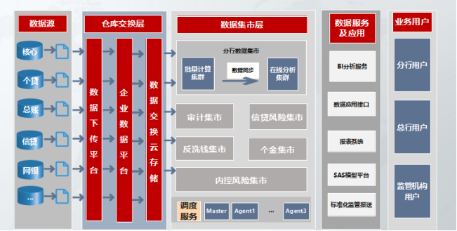 通过中行数据交换平台将整体数据传输至数据集市层,数据来源包括:核心系统、个贷系统、总账系统、信贷系统、网银系统、风险系统等业务