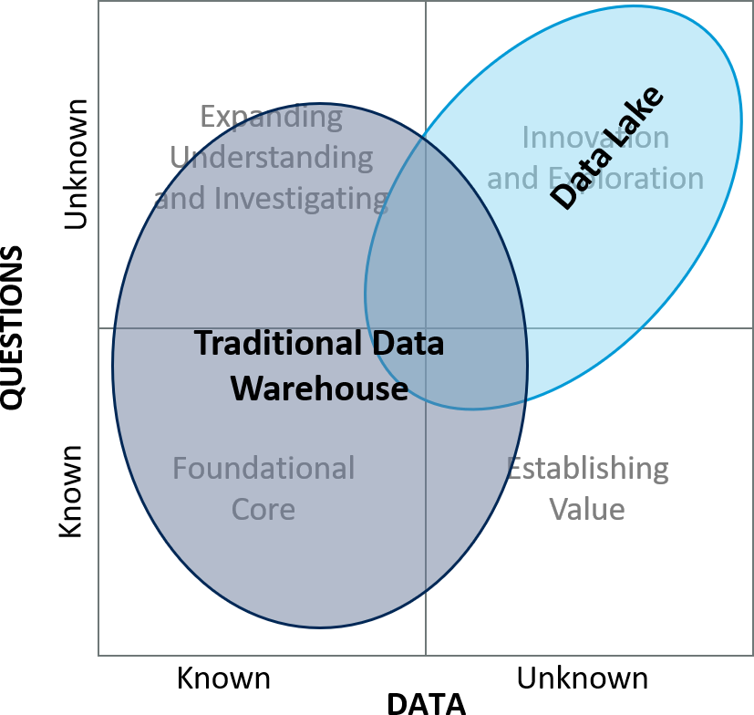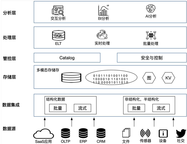 2. 规范标准阶段:数仓(Data Warehouse)到了1980年代中后期,为解决数据库面对数据分析的不足,孕育出新一类产品数据仓库。让我们先来看下数据仓库的定义,数据仓库(Data Warehouse)是一个面向主题的、集成的、相对稳定的、反映历史变化的数据集合,用于支持管理决策和信息的全局共享。上图是数据仓库的应用架构,从中可见其做了若干阶段划分,简单可分为数据集成(装载)、数据加工(ETL)、数据汇聚、数据展示及挖掘。数据经过这一过程,被抽取到数据仓库中,并严格按照预先定义的模式被装载进来,经过多层加工形成数据集市,并最终提供给终端应用或进一步供挖掘使用。在技术实现上,主流采用MPP无共享存储架构,基于标准X86服务器,可实现数百节点的扩展。其对外提供标准的SQL能力和ACID特性,整体计算性能可在一定程度上随节点扩展可提升。数据仓库架构非常经典,在一定时期内满足了数据分析需求,也促进数据分析场景的演进发展。从上图我们看到数据仓库的发展,经历了多个阶段。从固定报表,满足T+1时效性即可;到分析型需求增加,需提供灵活深度查询能力;到预测型需求,需满足多维度分析预测能力;到运营型数仓,不再局限在后台提供服务,而强调实时变化、分析学习、反馈控制;再到智慧型数仓,强调人工智能全面感知能力。可以说,数据仓库一路走来,不断演进变化,大大促进了数据在企业内的应用水平,直到今日仍然是很多企业应对数据分析的不二之选。当然,随着数据在企业内角色愈发重要,对其分析的要求不断提高。传统的数据仓库架构也面临很多的挑战。例如,随着数据规模扩大,对数据承载能力(容量、算力)的要求也不断增大,数仓架构的扩展能力急需考验;上述规模的扩展会面临大量资源的投入,硬件资源缺乏弹性,会导致高峰时资源不足,低谷时资源闲置浪费问题;随着对数据鲜活程度要求提高,对数据处理时长有着更为严格的要求,否则将无法指导业务运营;针对数据类型,也不在局限于结构化数据,更多半结构化、非结构化数据被更多利用起来;此外,在数据价值挖掘、数据安全等方面都提出了更高的要求。针对上述难点,也催生了一系列技术的发展,例如HTAP、大数据分析等,也包括后面重点谈到的数据湖。Data Lake,是在2011年由James Dixon提出,其与数据仓库的主要区别在于数据仓库中数据在进入仓库之前是需要实现归类,而数据库是把大量原始数据通过廉价存储保存下来。数据仓库具有高度结构化的架构,用户可直接获得分析数据;而数据湖是将数据直接加载到湖中,然后根据分析的需求再转换数据。数据湖架构的特点可总结为:低成本、原始数据、需灵活可使用、面向任务数据绑定、不提前定义数据模型。在实现技术上面,多采用基于Hadoop生态的产品,兼具有MPP、Hive/Spark、NoSQL、Stream/Batch能力。具备良好的扩展能力,可支持数千节点的超大规模集群。但对SQL支持偏弱、ACID特性支持差,较难从传统数据仓库迁移过来。业务上更为强调数据资产管理与数据服务。这里我们对数据仓库和数据湖做个简单对比,可以看出两者差异很多。基本上属于互补关系,各有其适合覆盖场景。前者更多是解决固定的、明确的数据问题;后者则为应对随机性、探索式的数据问题。下图可以更为准确的描述两者差异。4. 融合共享阶段:湖仓一体(LakeHouse)提到湖仓一体,就不得不从上世纪80年代说起。当时市场还是数据仓库的天下,主要用来处理BI、仪表盘、报表等结构化数据,用于分析企业的内部的业务数据。这种状态一直持续到2010年前后,越来越多企业产生对语音、视频等数据的处理分析需求,非结构化数据、半结构化数据的增长促使企业提升了高多样性,高速度和高容量的数据分析要求,数据仓库慢慢不能满足用户的需求。随着数据仓库局限性的逐步显现,数据湖的概念也随之衍生出来,它能够存储各式各样的原始数据,解决了数据仓库的局限性。但相比于优势来讲,湖的短板也同样明显,比如不支持事务,SQL性能差,无法支撑报表需求。虽然数据湖和数据仓都各自有各自的优势和不足,但不难发现,二者在某些层面是非常互补的。于是乎,是否有一种能兼具两者优点的架构出现,于是诞生了“湖仓一体”。早期的湖仓一体,更多是一种处理思想,处理上直接将数据湖和数据仓库互相“打通”。数据湖从各类数据源获得原始数据,存储在廉价存储上,永久不删除。数据保持原始简单格式、机构,无数据治理,也没有数仓丰富的功能及高性能统一数据模型。当需要支持分析场景在成熟时从数据湖到数据仓库的迁移。这种架构优点在于可充分利用先前的数据湖和数据仓库资源,利用ETL将二者“打通”,数据湖用来存储各种原始数据,分析报表交给数据仓库来完成,这也可以算是湖仓一体的一个雏形,但湖和仓基本上还是处于各自一体的状态,架构仍然较为复杂,在满足需求的同时也持续提高了企业的运维成本。为了解决湖仓一体1.0的诸多问题,2.0应运而生。目前这一架构还在快速发展之中,尚无明确统一的技术框架。总的来说,可按照上图划分多层次,并在每层解决对应问题。从底层数据源,需对接多种数据源(包括结构化、半结构化及非结构化数据)。之上的数据集成需提供针对不同特征数据的集成能力(包括批量、流式)。处理过后的数据放入统一存储层,为面对不同结构的数据,需提供多
