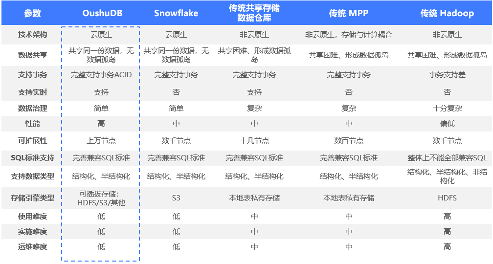国内的偶数科技的技术路线与Snowflake在湖仓一体的思路非常相似。主要是依托云原生特性、存算分离架构、强事务特性、完整SQL标准、高性能并行执行等技术能力,实现高弹性、高性能、强扩展性、强兼容性以及上层支持机器学习等,帮助企业有效应对大规模、强敏态、高时效、智能化发展趋势。其产品技术架构可参考如下:在这一架构中,偶数科技通过自研的新一代存算分离架构产品,实践湖仓一体2.0理念。其中核心技术亮点众多。包括功能强大的基于代价的优化器,实现系统自动选择最优执行计划;可充分利用最新CPU特性SIMD单指令多数据流,能做到指令内并行的新一代执行器引擎;多级资源队列,可通过DDL方便地定义和修改资源队列;原生Magma存储引擎与S3、HDFS混合使用,解决高性能与低成本的存储问题;多种优化存储格式,包括AO、Parquet、ORC等等。下图简单对比了包括Snowflake、偶数科技产品与传统数仓产品。随着数据在数字化转型中发挥着愈发重要的作用,如何挖掘、利用、提升数据价值成为核心重点。湖仓一体的出现,突破了原有数据仓库架构和数据湖架构的局限,兼具两者之优点。为企业提供功能完整、可扩展、低成本、高收益的数据分析能力。相信,随着这一技术不断演进发展,必将加速企业数字化进程,享受到更多数据红利。也期待有更多的厂商、产品诞生,助力企业数字化转型。