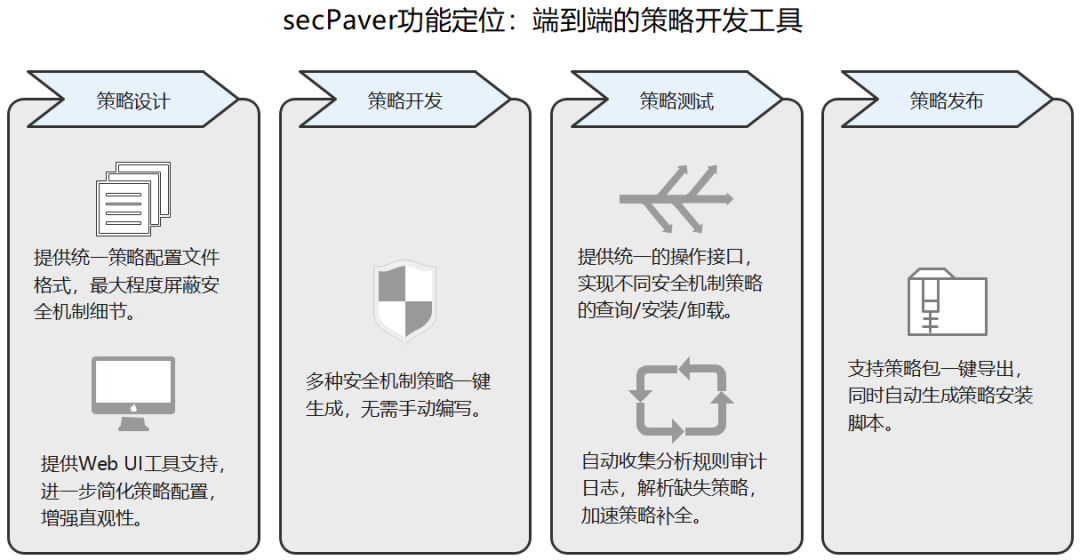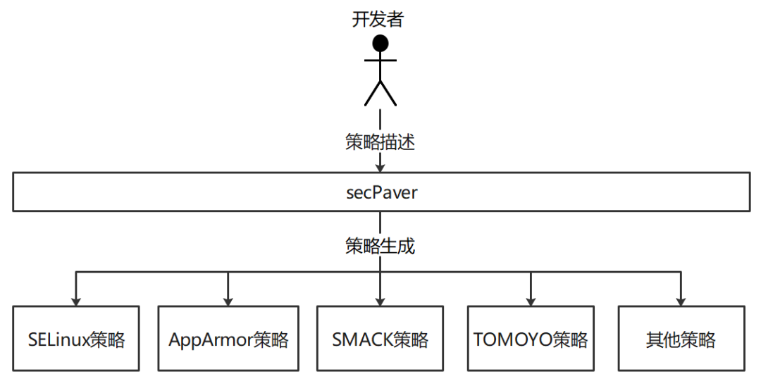 其核心理念是抽象封装出一组通用的策略描述方法和策略操作接口,开发者无需详细了解安全机制细节,只需使用secPaver配置策略描述即可,具体的安全策略由secPaver生成。