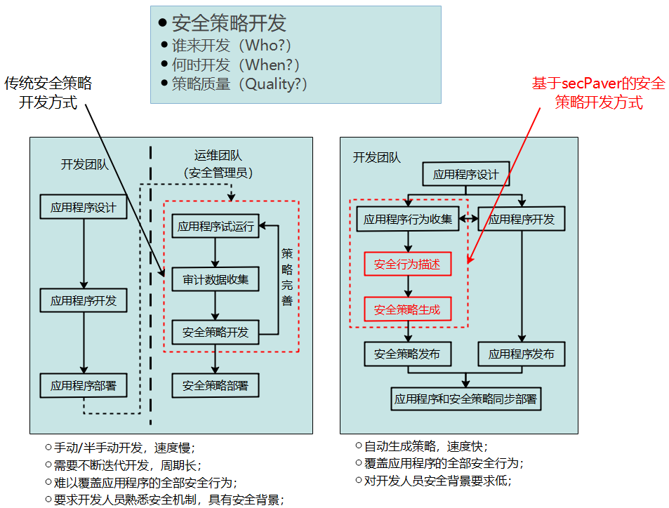 相比传统的安全策略开发方式,使用secPaver可以降低开发者对安全机制的知识背景要求,简化策略开发流程,提高策略开发效率,实现软件和安全策略同步发布。
