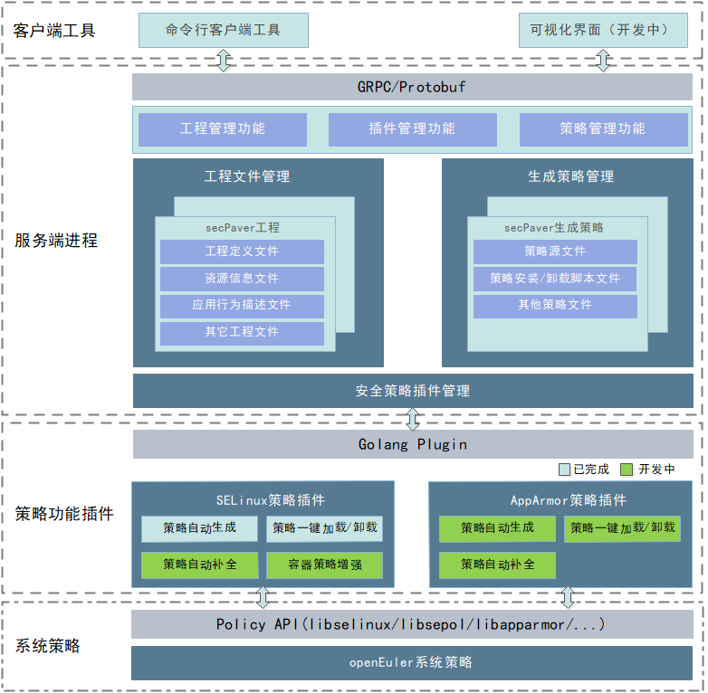 secPaver使用go语言开发,为客户端/服务端架构。用户可以通过客户端工具与服务端进程交互,进行安全策略开发工作。服务端为一个systemd服务进程,提供策略开发所需要的具体功能。secPaver采用go-plugin机制,对于不同安全机制的开发的差异化功能实现,封装在不同的插件,由服务端进程加载调用。secPaver当前支持SELinux策略开发功能,未来将支持AppArmor以及更多的策略开发功能。