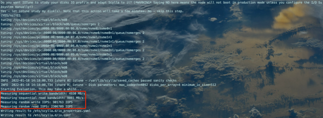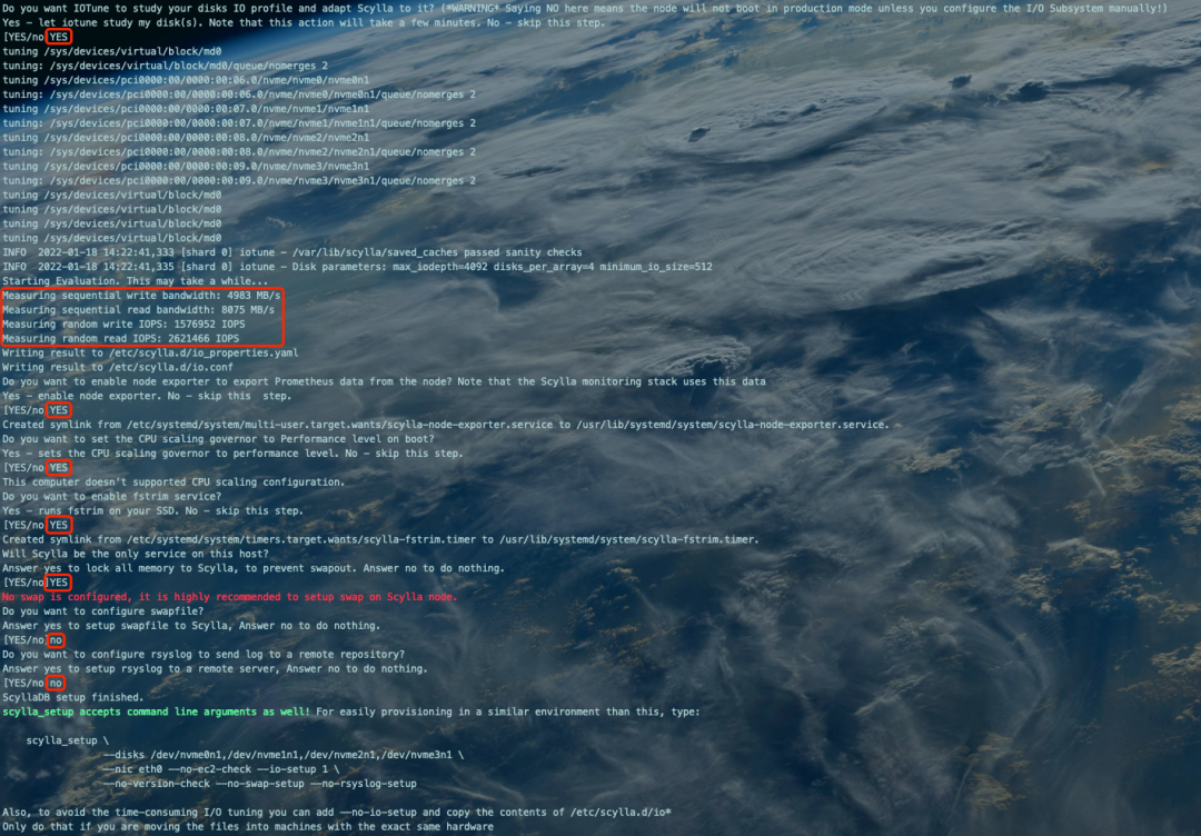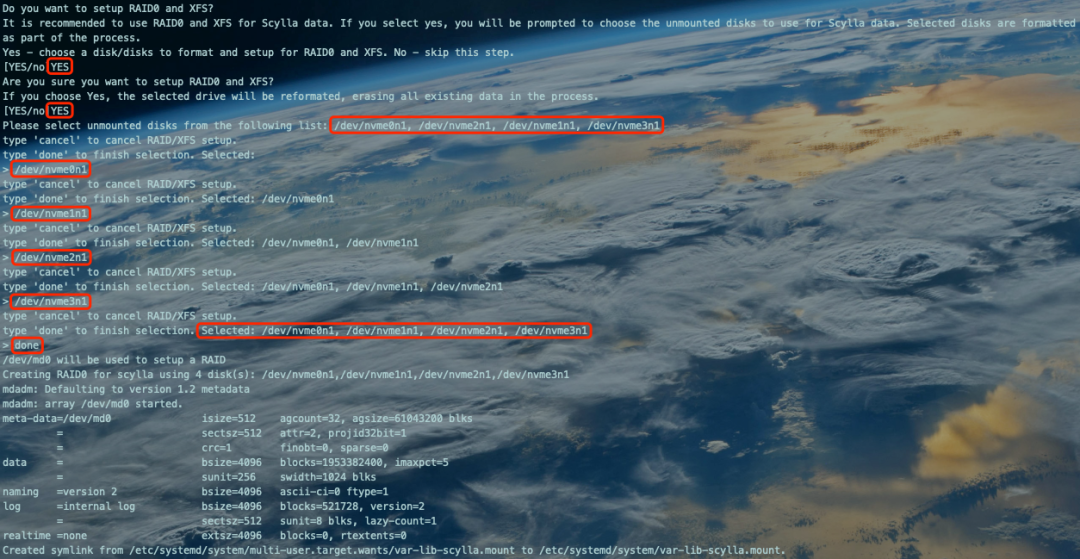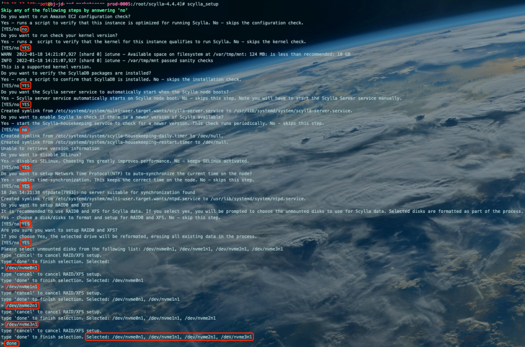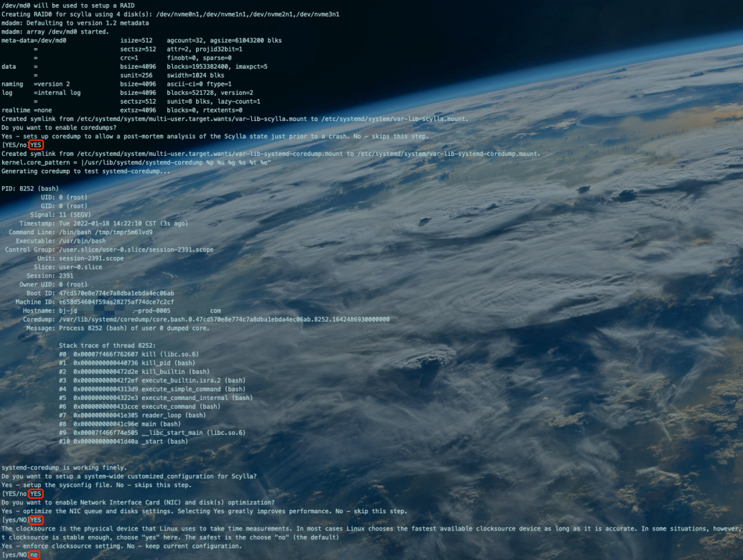 [10.xx.xx.xxx:root@bj-jd-xxx-xxxxxx-prod-0005:/root/scylla-4.4.4]# scylla_setupSkip any of the following steps by answering 'no'Do you want to run Amazon EC2 configuration check?Yes - runs a script to verify that this instance is optimized for running Scylla. No - skips the configuration check.[YES/no]no #是否进行Amazon EC2型云服务器配置检测,我们是京东云,不检测,填写noDo you want to run check your kernel version?Yes - runs a script to verify that the kernel for this instance qualifies to run Scylla. No - skips the kernel check.[YES/no]YES #检查内核是否支持ScyllaWARN 2022-01-18 14:21:07,927 [shard 0] iotune - Available space on filesystem at /var/tmp/mnt: 124 MB: is less than recommended: 10 GBINFO 2022-01-18 14:21:07,927 [shard 0] iotune - /var/tmp/mnt passed sanity checksThis is a supported kernel version.Do you want to verify the ScyllaDB packages are installed?Yes - runs a script to confirm that ScyllaDB is installed. No - skips the installation check.[YES/no]YES #检查Scylla是否安装Do you want the Scylla server service to automatically start when the Scylla node boots?Yes - Scylla server service automatically starts on Scylla node boot. No - skips this step. Note you will have to start the Scylla Server service manually.[YES/no]YES #设置Scylla自启动Created symlink from /etc/systemd/system/multi-user.target.wants/scylla-server.service to /usr/lib/systemd/system/scylla-server.service.Do you want to enable Scylla to check if there is a newer version of Scylla available?Yes - start the Scylla-housekeeping service to check for a newer version. This check runs periodically. No - skips this step.[YES/no]no #是否检查更新,不检查,填写noCreated symlink from /etc/systemd/system/scylla-housekeeping-daily.timer to /dev/null.Created symlink from /etc/systemd/system/scylla-housekeeping-restart.timer to /dev/null.Unable to retrieve version informationDo you want to disable SELinux?Yes - disables SELinux. Choosing Yes greatly improves performance. No - keeps SELinux activated.[YES/no]YES #是否关闭SELinuxDo you want to setup Network Time Protocol(NTP) to auto-synchronize the current time on the node?Yes - enables time-synchronization. This keeps the correct time on the node. No - skips this step.[YES/no]YES #是否设置NTP18 Jan 14:21:38 ntpdate[7993]: no server suitable for synchronization foundCreated symlink from /etc/systemd/system/multi-user.target.wants/ntpd.service to /usr/lib/systemd/system/ntpd.service.Do you want to setup RAID0 and XFS?It is recommended to use RAID0 and XFS for Scylla data. If you select yes, you will be prompted to choose the unmounted disks to use for Scylla data. Selected disks are formatted as part of the process.Yes - choose a disk/disks to format and setup for RAID0 and XFS. No - skip this step.[YES/no]YES #是否选择设备设置软RAID0Are you sure you want to setup RAID0 and XFS?If you choose Yes, the selected drive will be reformated, erasing all existing data in the process.[YES/no]YES #填写YES,开始设置Please select unmounted disks from the following list: /dev/nvme0n1, /dev/nvme1n1, /dev/nvme2n1, /dev/nvme3n1type 'cancel' to cancel RAID/XFS setup.type 'done' to finish selection. Selected:> /dev/nvme0n1 #选中第1个裸设备type 'cancel' to cancel RAID/XFS setup.type 'done' to finish selection. Selected: /dev/nvme0n1> /dev/nvme1n1 #选中第2个裸设备type 'cancel' to cancel RAID/XFS setup.type 'done' to finish selection. Selected: /dev/nvme0n1, /dev/nvme1n1> /dev/nvme2n1 #选中第3个裸设备type 'cancel' to cancel RAID/XFS setup.type 'done' to finish selection. Selected: /dev/nvme0n1, /dev/nvme1n1, /dev/nvme2n1> /dev/nvme3n1 #选中第4个裸设备type 'cancel' to cancel RAID/XFS setup.type 'done' to finish selection. Selected: /dev/nvme0n1, /dev/nvme1n1, /dev/nvme2n1, /dev/nvme3n1 #选中的裸设备列表> done #确认选中的裸设备列表,填写done完成选择/dev/md0 will be used to setup a RAIDCreating RAID0 for scylla using 4 disk(s): /dev/nvme0n1,/dev/nvme1n1,/dev/nvme2n1,/dev/nvme3n1mdadm: Defaulting to version 1.2 metadatamdadm: array /dev/md0 started.meta-data=/dev/md0 isize=512 agcount=32, agsize=61043200 blks = sectsz=512 attr=2, projid32bit=1 = crc=1 finobt=0, sparse=0data = bsize=4096 blocks=1953382400, imaxpct=5 = sunit=256 swidth=1024 blksnaming =version 2 bsize=4096 ascii-ci=0 ftype=1log =internal log bsize=4096 blocks=521728, version=2 = sectsz=512 sunit=8 blks, lazy-count=1realtime =none extsz=4096 blocks=0, rtextents=0Created symlink from /etc/systemd/system/multi-user.target.wants/var-lib-scylla.mount to /etc/systemd/system/var-lib-scylla.mount.Do you want to enable coredumps?Yes - sets up coredump to allow a post-mortem analysis of the Scylla state just prior to a crash. No - skips this step.[YES/no]YES #是否设置coredumpCreated symlink from /etc/systemd/system/multi-user.target.wants/var-lib-systemd-coredump.mount to /etc/systemd/system/var-lib-systemd-coredump.mount.kernel.core_pattern = |/usr/lib/systemd/systemd-coredump %p %u %g %s %t %e"Generating coredump to test systemd-coredump...PID: 8252 (bash) UID: 0 (root) GID: 0 (root) Signal: 11 (SEGV) Timestamp: Tue 2022-01-18 14:22:10 CST (3s ago) Command Line: /bin/bash /tmp/tmpr5m6lvd9 Executable: /usr/bin/bash Control Group: /user.slice/user-0.slice/session-2391.scope Unit: session-2391.scope Slice: user-0.slice Session: 2391 Owner UID: 0 (root) Boot ID: 47cd570e8e774c7a8dba1ebda4ec06ab Machine ID: e658d54604f59aa28275af74dce7c2cf Hostname: bj-jd-xxx-xxxxxx-prod-0005.xxxxxx.com Coredump: /var/lib/systemd/coredump/core.bash.0.47cd570e8e774c7a8dba1ebda4ec06ab.8252.1642486930000000 Message: Process 8252 (bash) of user 0 dumped core. Stack trace of thread 8252: #0 0x00007f466f762607 kill (libc.so.6) #1 0x0000000000440736 kill_pid (bash) #2 0x0000000000472d2e kill_builtin (bash) #3 0x000000000042f2ef execute_builtin.isra.2 (bash) #4 0x00000000004313d9 execute_simple_command (bash) #5 0x00000000004322e3 execute_command_