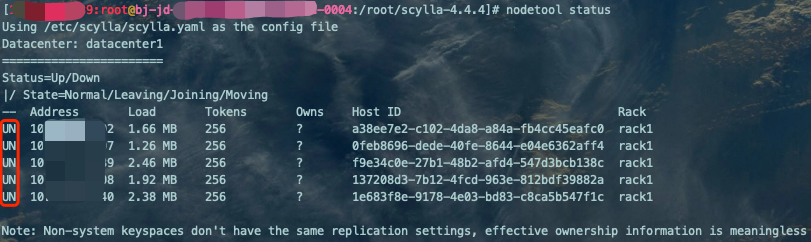 最前面的列值都为UN就代表正常,如图已给出提示(U:Up,N:Normal)。至此,一个可直接用于生产环境的5节点ScyllaDB数据库集群部署完成。