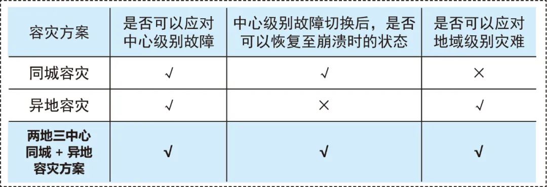 相比跨中心的同城容灾和跨地域的异地容灾,两地三中心容灾方案结合两者的优势,可以同时应对中心级别故障和地域级别灾难。
