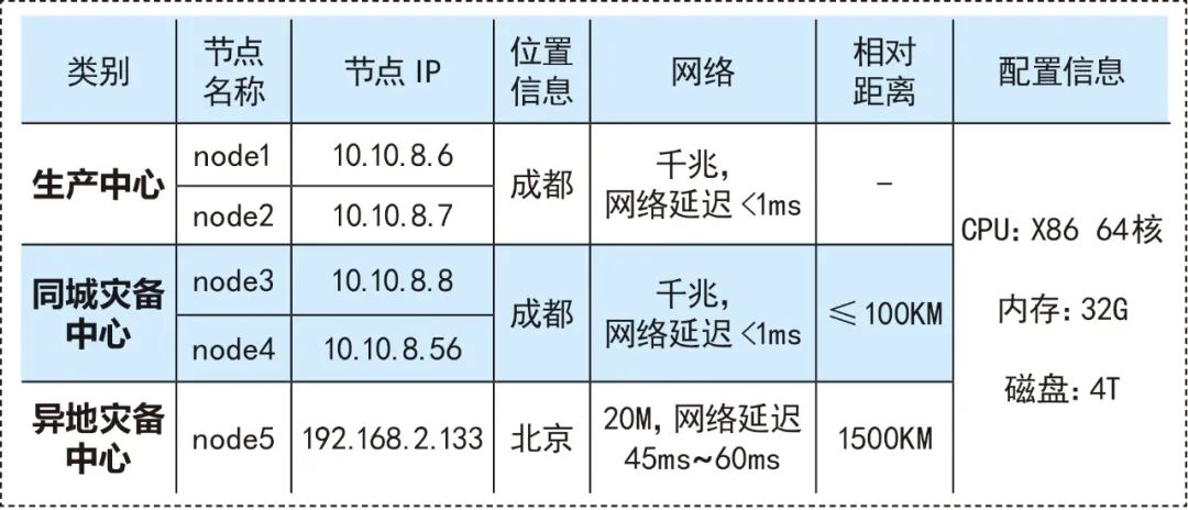 此次金仓KingbaseES两地三中心集群灾难恢复演练采用5个数据库节点的模式,将生产中心、同城灾备中心放置于成都相隔30km机房,异地灾备中心放置于北京机房(成都至北京的直线距离约为1500km,绝大多数用户的灾备系统设计的灾备距离不会超过此值,最大限度地覆盖了客户的灾备场景)。