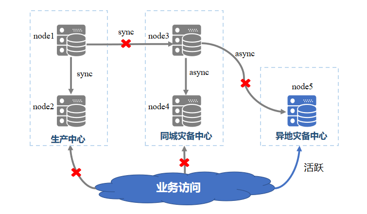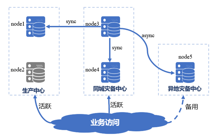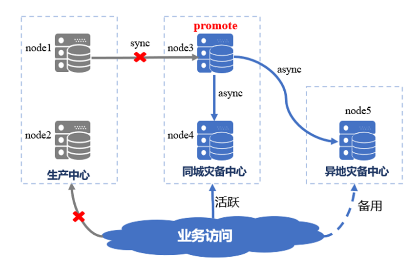 先自动恢复node1,作为同步备库恢复。再自动恢复node2,作为异步备库恢复。在业务恢复期间,同城灾备中心始终对外提供服务,恢复过程对用户无感,RTO/RPO=0!