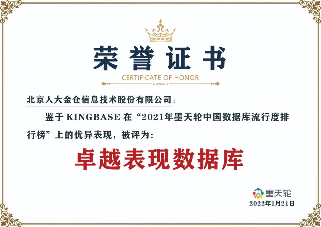 1月21日,由墨天轮主办的“2022年新春发布会暨年度数据库颁奖盛典”成功举办,人大金仓荣获“年度卓越表现数据库”。