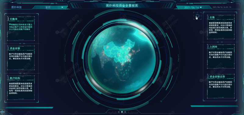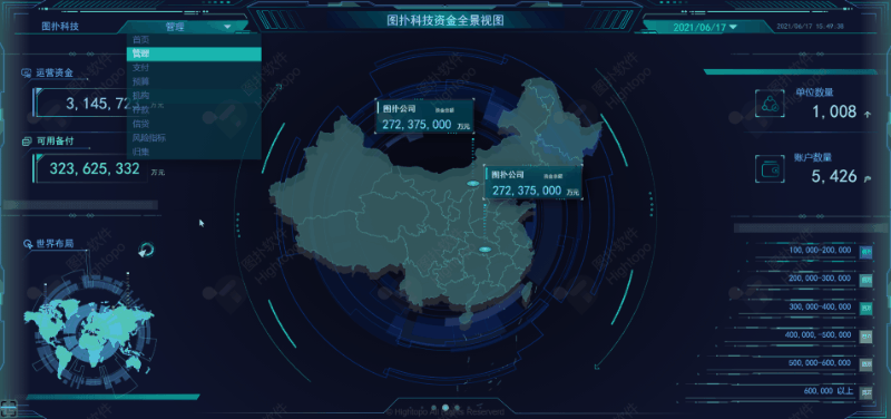 基于可视化视角的金融资产管理,目的是把产、供、销和人、物、财等信息进行高度集中。屏幕中展示企业各分公司的分布地、资金总额、运营金额、可用备付金、企业数量等,并选择以世界地图与中国地图的形式为主体,宏观展示企业在各国的业务开展情况,全面展示企业在中国及世界范围内的前瞻布控。需遵循数字化、智能化、生态化的方向建设,不仅仅要实现集团内部企业集中管理,更要延展至产业链上下游,连通供应链上下游客户及供应商的信息,并以核心企业的信用为依托,开展供应链金融,为上下游产业链赋能。