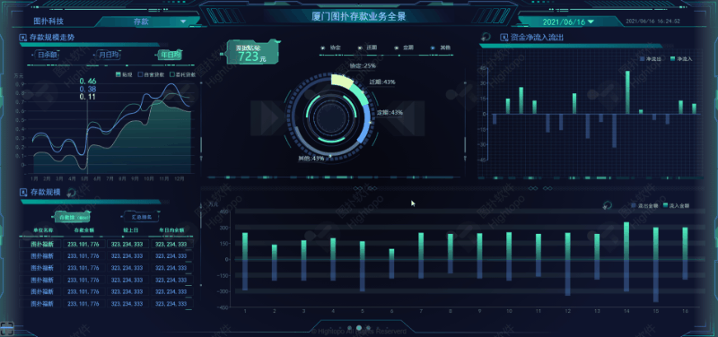 采用 Hightopo 制作的金融资产数据可视化看板大屏,除了拥有丰富的数据可视化组件,还能利用 2D、3D 结合的优势,多维度呈现金融资产数据。3D 场景采用以 HT 轻量化 HTML5 / WebGL 建模的方案,实现快速建模;同时又不去限制设计师在 3D 场景中的发挥;而在对应的 2D 图纸上,在各种比例下不失真,解决了不同屏幕比例下的展示问题。
