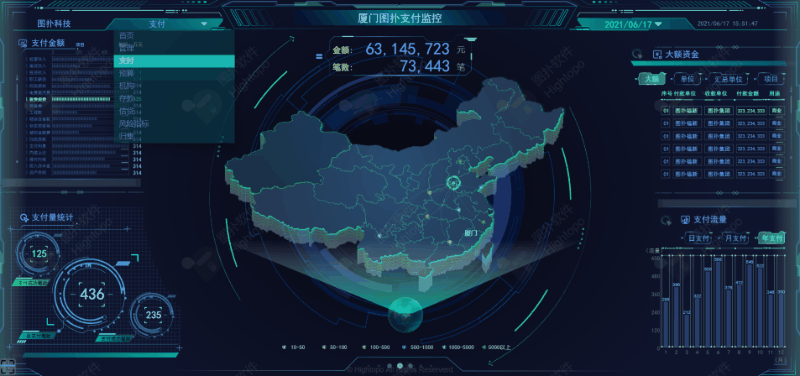 在过去的几十年里,资金管理系统侧重点为可控性,是通过一系列繁琐的流程和审批来进行支付类目管理。支付类目管理可视化以资金流为主线,通过地图上的信息标识,统计出各公司所支付金额和总量,将企业现有业务项目像(施工进度节点、融资计划、职工薪资等)、大额资金流变动、支付量统计进行一体化呈现。
