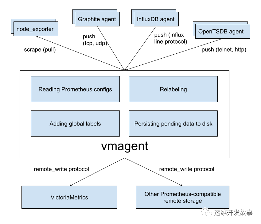 直译过来就是 vmagent是一个微小但又十分强大的agent,它可以帮助我们从不同的来源处收集指标,将指标存储在vm或者其他支持remote_write协议的prometheus兼容的存储系统。下面是官方给的一个架构图: