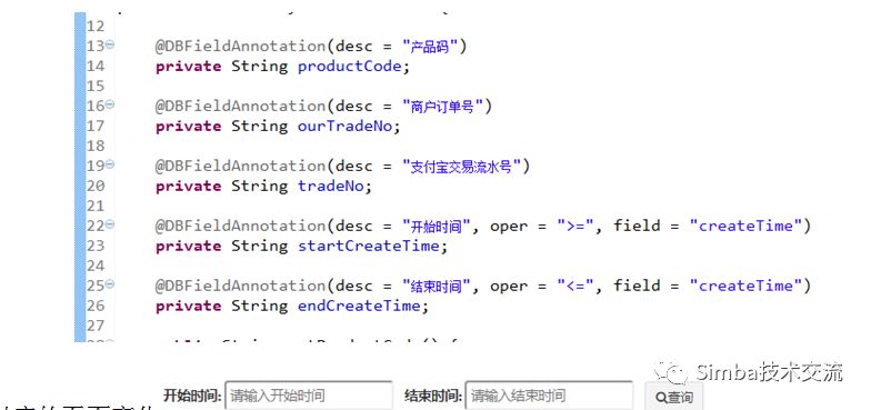 在Form类中定义startCreateTime和endCreateTime, 通过@DateTimeFormat定义时间的格式,使用@DBFieldAnnotation设置数据库字段为createTime,比较的逻辑是createTime>startCreateTime and createTime<=endCreateTime,在页面上显示的内容是desc中指定的内容。