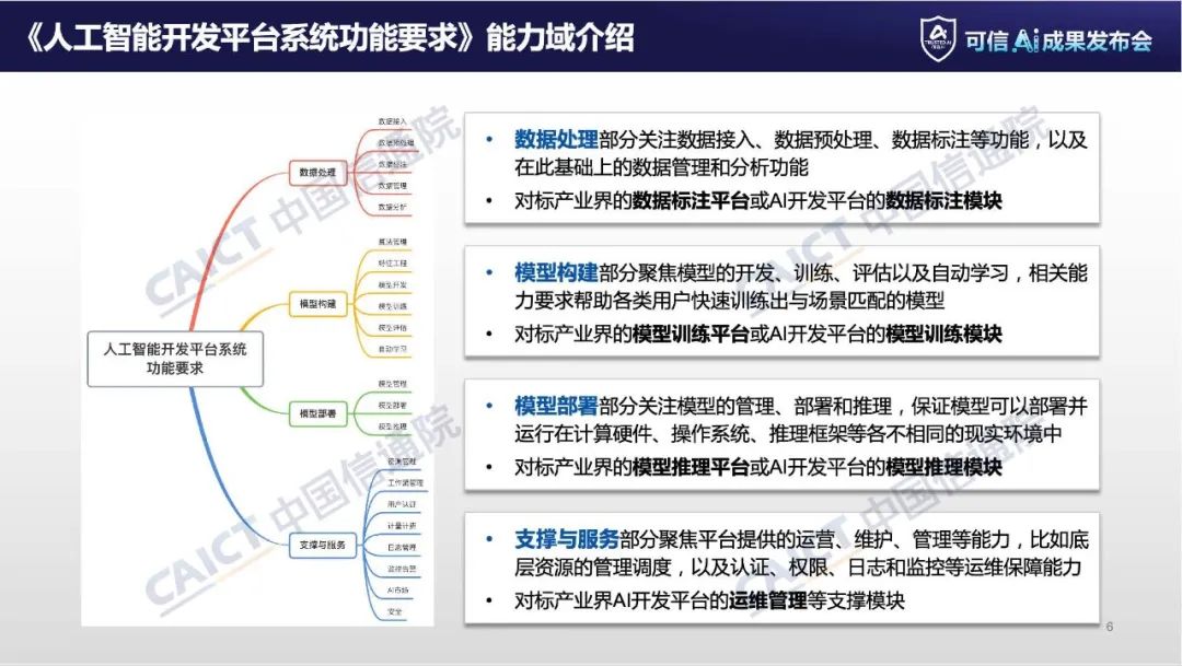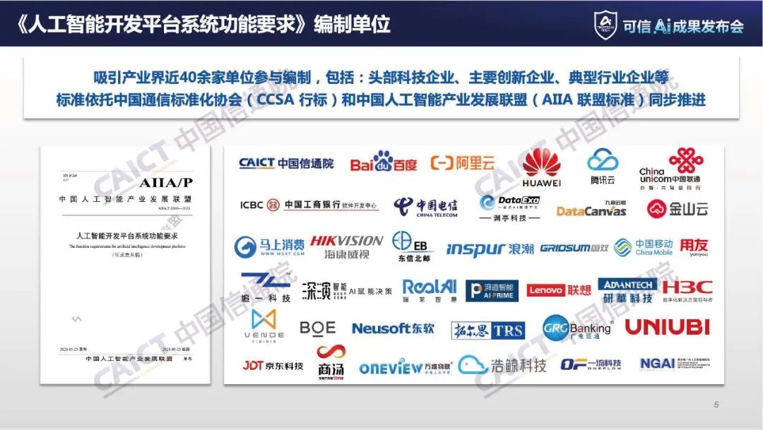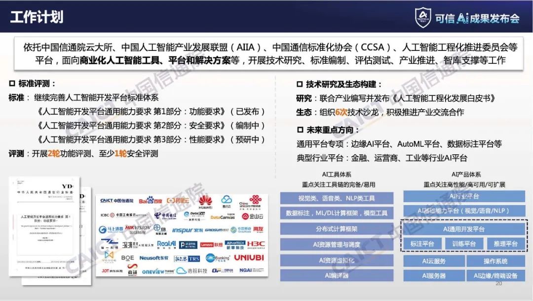 为解决人工智能开发平台产品质量良莠不齐的现状,助力用户方选型和产品方研发,中国信通院云计算与大数据研究所联合产业界近40余家单位联合完成了《人工智能开发平台系统功能要求》标准。目前该标准正在中国通信标准化协会(CCSA)以行标报批状态、在中国人工智能产业发展联盟(AIIA)以团标发布状态同步推进中。