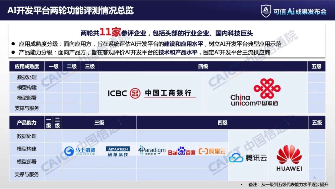 两轮评测共11家企业参加,其中:中国工商银行、中国联通、华为云、腾讯云的平台全能力域通过4级,平台整体达到国内领先水平;百度、阿里云、第四范式平台的模型构建能力域通过4级,单能力域达到国内领先水平;马上消费、研华科技平台的模型构建能力域通过3级,单能力域达到国内先进水平。