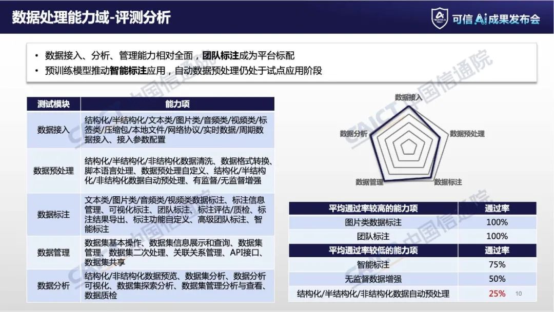 数据处理能力域方面,数据接入、数据分析、数据管理和数据标注通过率较高,而数据预处理通过率较低。组织结构健全的团队标注成为平台标准配置,通过预训练模型实现智能标注成为平台亮点。各类数据预处理的自动化处于应用试点阶段,无监督数据增强仍需探索研究。